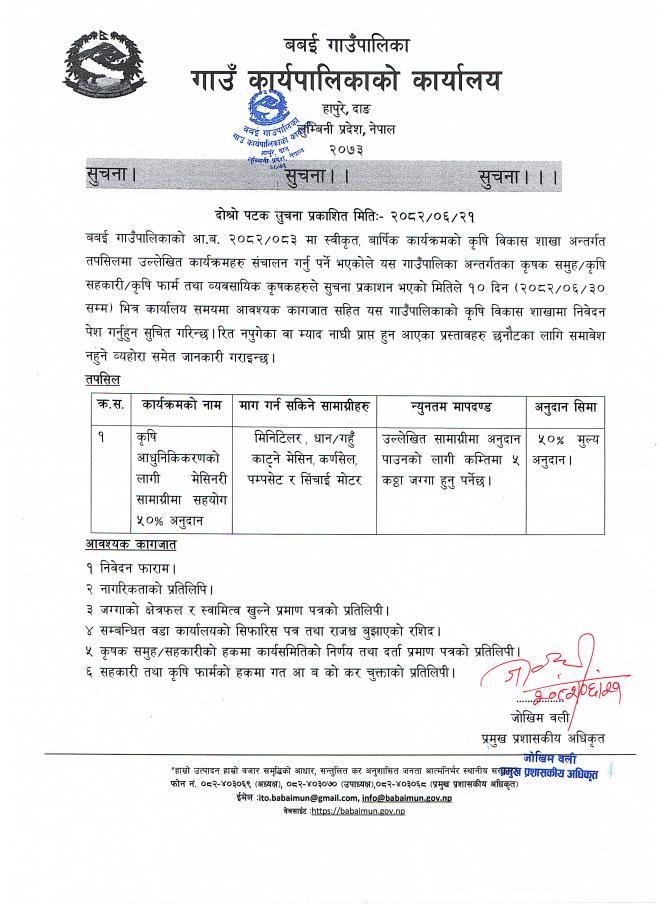 » कृषि आधुनिकरणको लागि मेसिनरी सामाग्रीमा सहयोग ५० % अनुदान सम्वन्धी सूचना