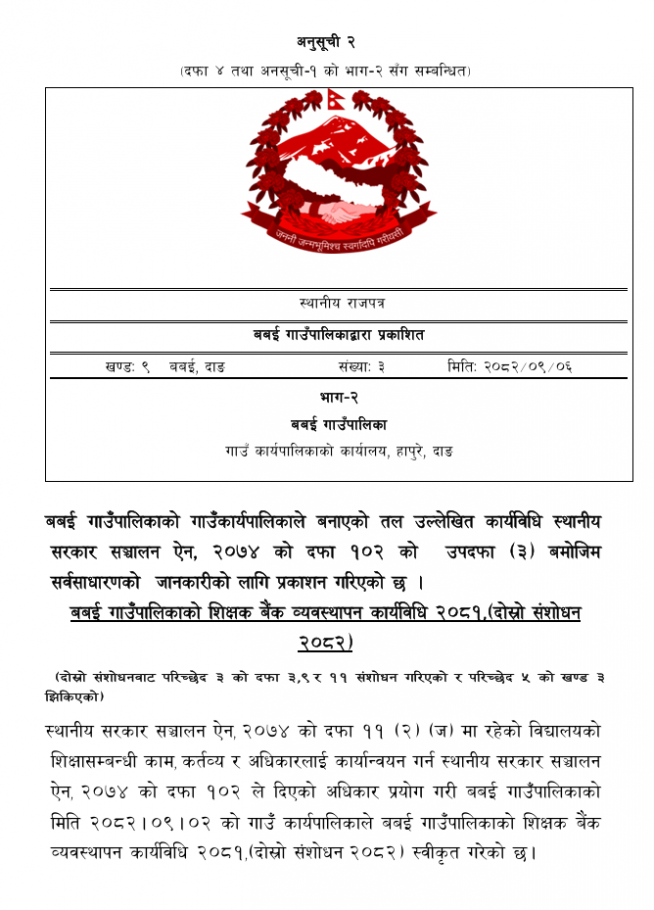बबई गाउँपालिकाको शिक्षक बैंक व्यवस्थापन कार्यविधि २०८१,(दोस्रो संशोधन २०८२)
