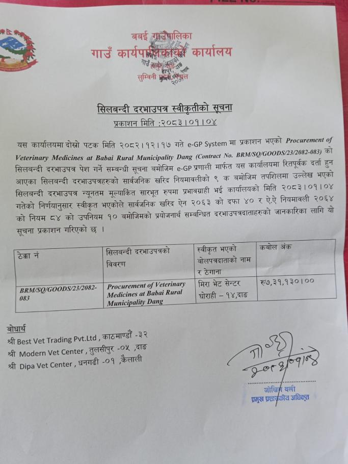 सिलबन्दी दरभाउपत्र स्वीकृतीको सूचना