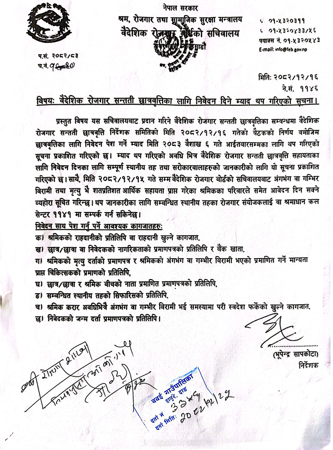 वैदेशिक रोजगार सन्तती छात्रवृत्तिका लागि निवेदन दिने म्याद थप गरिएको सूचना