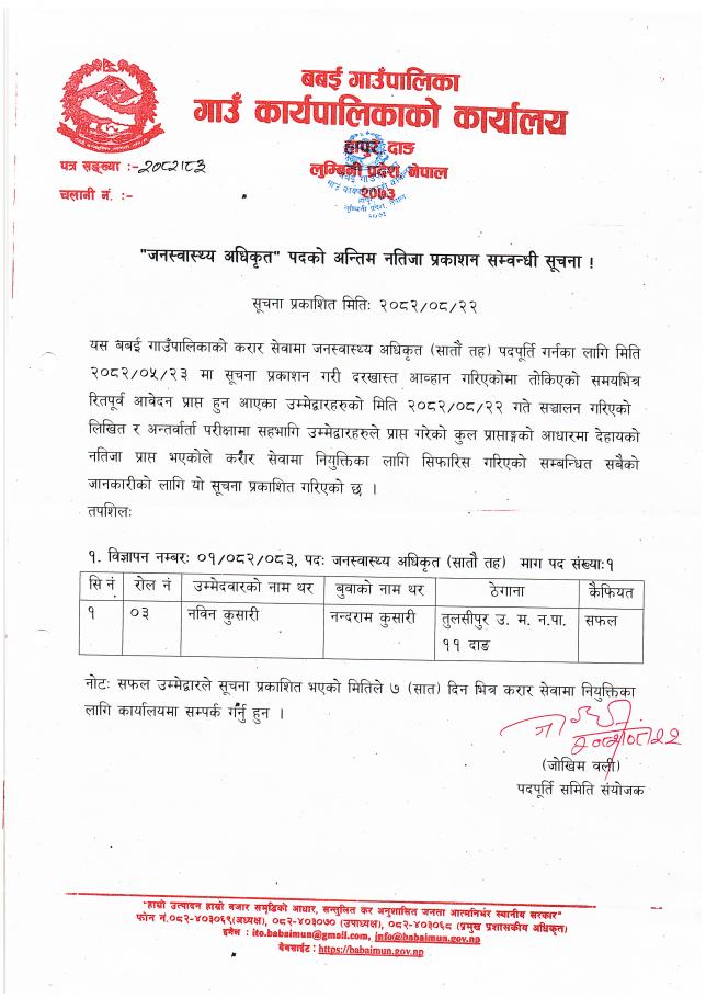 » जनस्वास्थ्य अधिकृत पदको अन्तिम नतिजा प्रकाशन सम्वन्धी सूचना