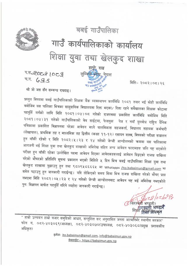 जेन्जी आन्दोलनका क्रममा प्राथमिक तह, विद्यालय सहायक कर्मचारी र माध्यमिक तह द्बित्तीय तहको आवेदन नष्ट भएको हुँदा पुन निवेदन दिने सम्वन्धी सूचना