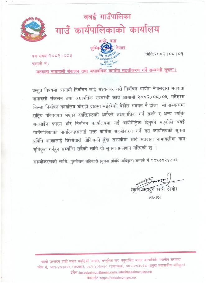 मतदाता नामावली संकलन तथा अद्यावधिक कार्यमा सहजीकरण गर्ने सम्वन्धी सूचना।