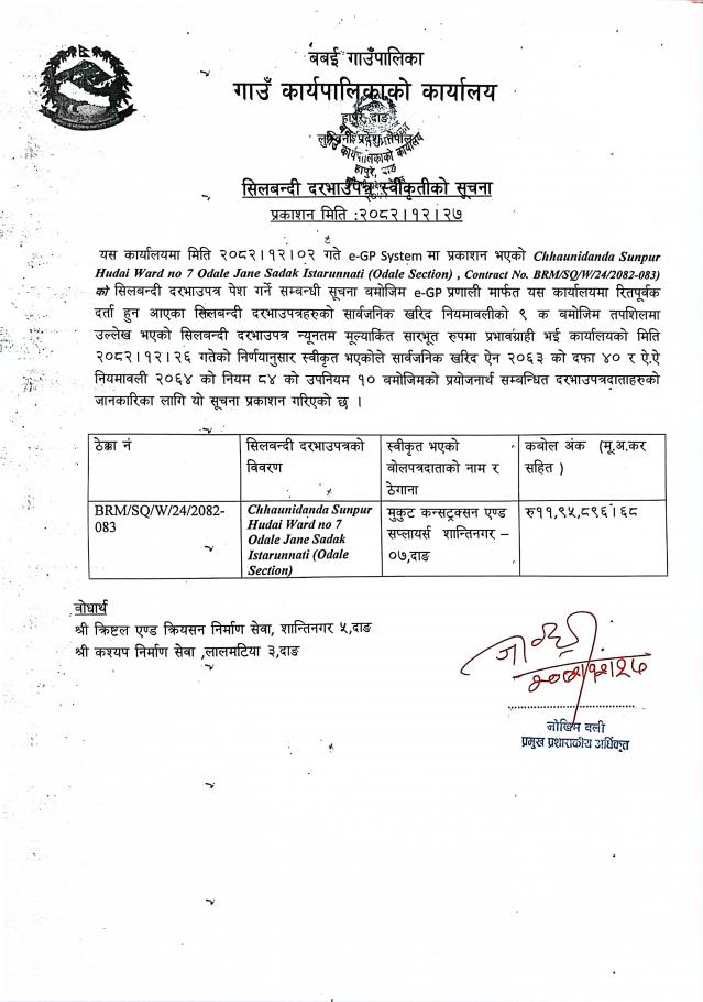 बोलपत्र स्वीकृत गर्ने आशयको सूचना
