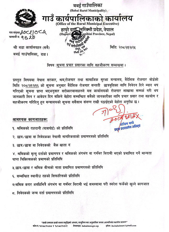 वैदेशिक रोजगार सन्तती छात्रवृत्तिका लागि निवेदन दिने म्याद थप गरिएको सूचना